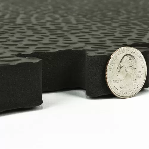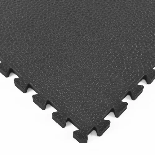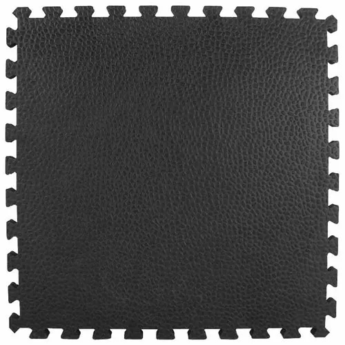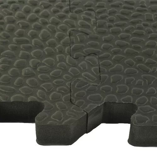 Our pebble workout room flooring pieces measure 2×2 feet, creating almost 4 square feet of coverage area per tile. (Because of the interlocking tiles, a little bit of the expected coverage is lost.) The interlocking edges like a puzzle simplify installation and hold them tightly in place, even when they’re subject to stress.