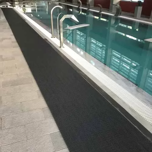 Our Heronrib matting excels in areas where people often will be walking in bare feet. It has a bit of flexibility to it, making it comfortable for people to walk across. And it has a slip resistant design that keeps kids safer when running near a pool.