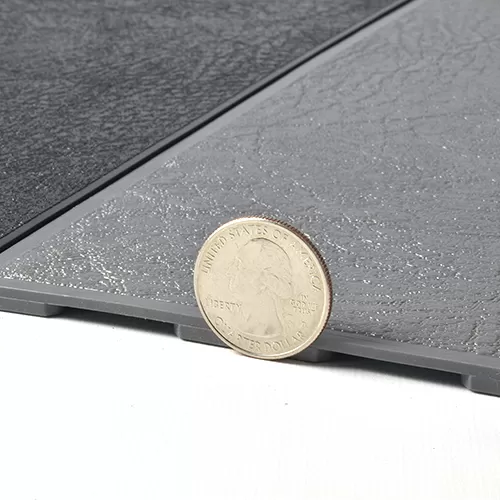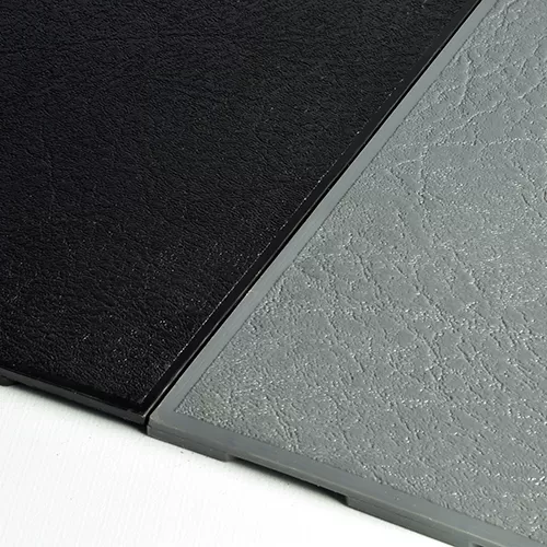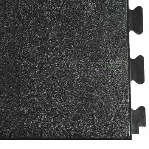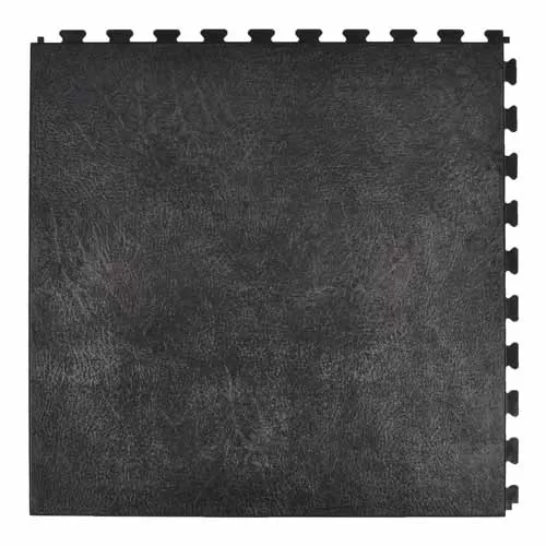 Available in classic black or dark gray, this leather look interlocking Perfection Floor Tile product can be easily installed and maintained. Once in place, this pvc flooring offers an upscale appearance for a low installed cost of less than $4 per square foot. These pvc floor leather tiles are great for projects small and large.