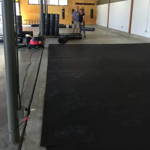 Rolled rubber can be used for weight room areas, storage rooms and ammunition rooms to name a few. Rubber roll floor can also be used in industrial applications. Rubber flooring rolls can be installed with either a tape down or glue down installation. Rolled rubber flooring can add comfort and durability to an otherwise hard surface. Rubber flooring rolled material is most commonly ordered in 100 percent black or with a 10 or 20 percent color in the mix.