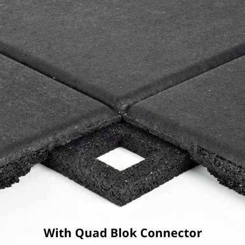 Rather than making use of an interlocking puzzle edge like some other rubber tiles, these tiles use pegs on the underside. To connect adjacent tiles, the installer will place a waffle-like Quad Blok connector over pegs on both tiles and glue it in place.